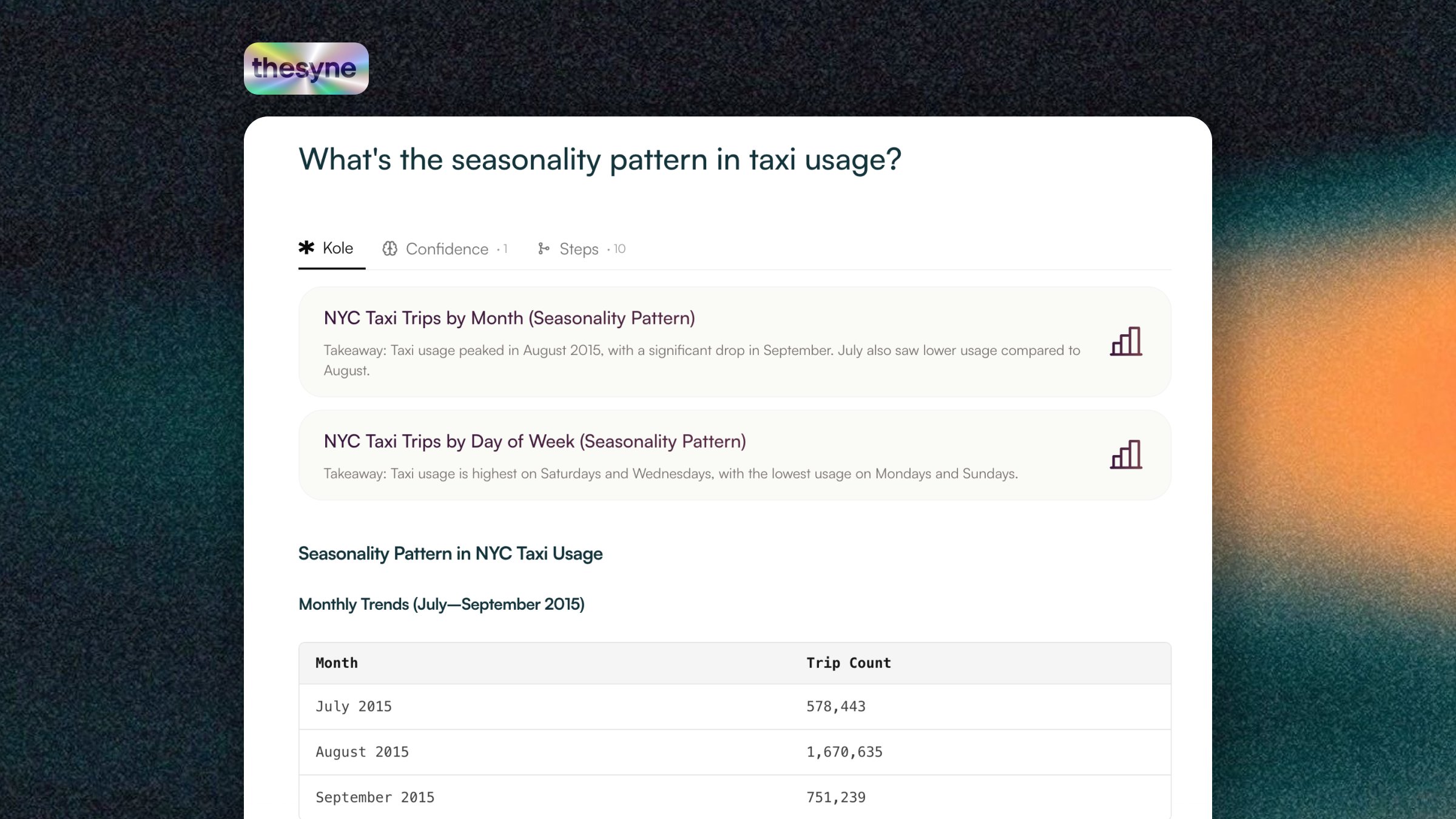 Bottom line: If you’re tired of waiting for data answers, SyneHQ is built for you. No technical expertise required, just ask questions and get insights. Available as a managed SaaS platform or enterprise self-hosted solution.